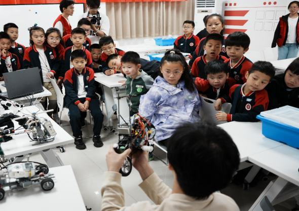 “医生通过操作机械臂就可以进行远程手术”,“智能小车能够在高温作业、灾区抢险等危险或难以完成的工作中替代人类,降低风险。”志愿者高宇一边展示着作品,一边向小员工们讲解,小员工们纷纷迫不及待地进行操作体验。“我们希望通过沉浸式体验,让小朋友们切实感受人工智能技术对生产生活的改变,感受科技力量和时代之变。”志愿者穆逸霖说道。