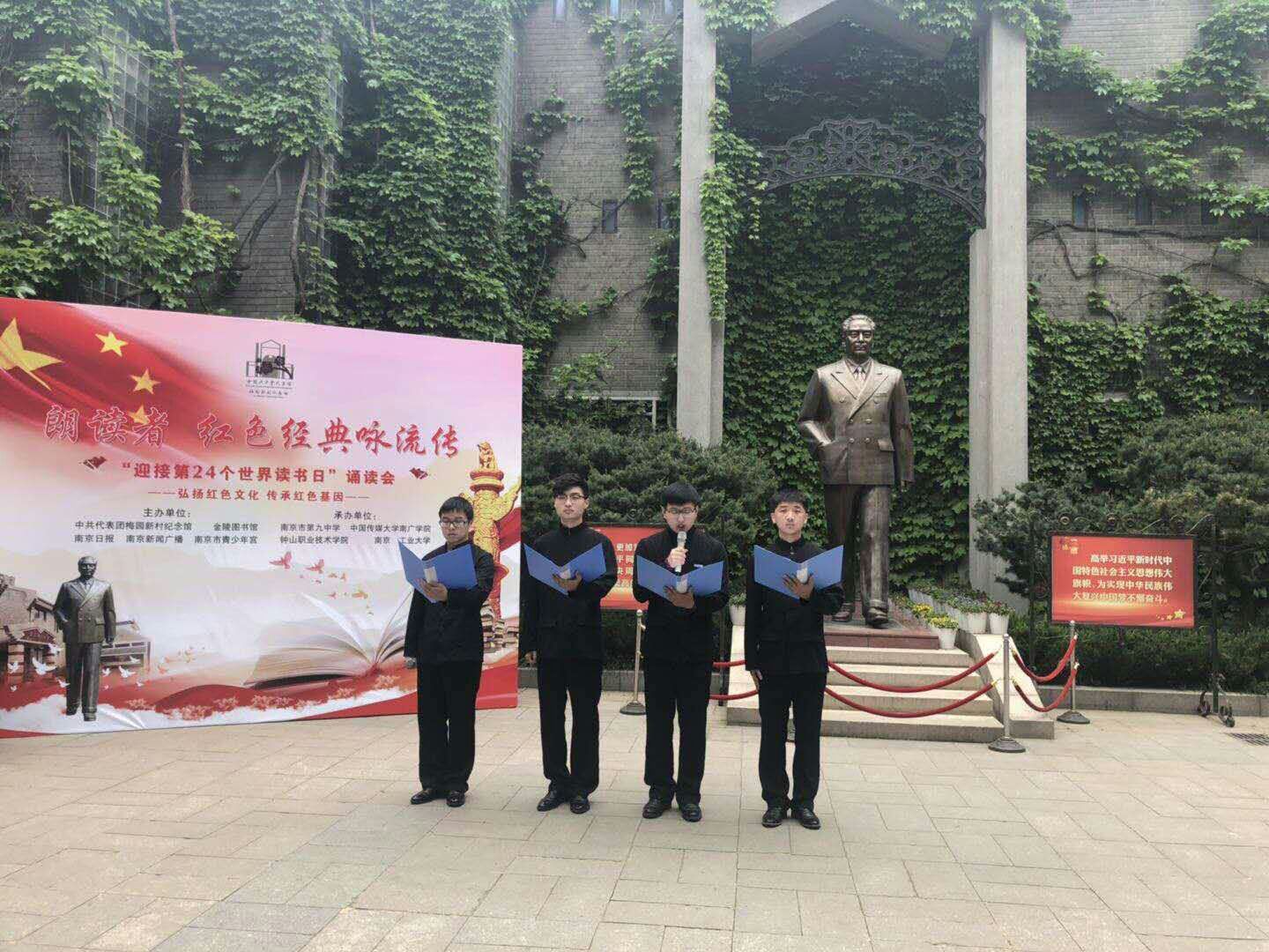 2019年4月23日,中共代表团梅园新村纪念馆、金陵图书馆、南京日报、南京新闻广播、南京市青少年宫等单位于梅园新村纪念馆联合举办了朗读者•红色经典咏流传——“迎接第24个世界读书日”诵读会。公司计软1602王天枢、计1703宋欣哲、毕建新、张昊楠四位同学参加此次朗诵会。