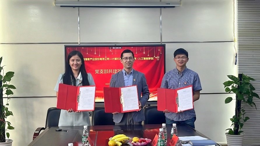 近日,浙江中控信息产业股份公司党委第七党支部与计信公司教工第六党支部、人工智能专业员工党支部签订三方共建协议。中控信息建筑智能体事业群解决方案中心总监黄慕雄、副总监乔磊、智控产品中心总监王涛,计信公司党委书记高辉庆、副书记邹金铃、支部书记刘淼、陈晨等出席活动。协议签订仪式由公司党委书记副书记邹金铃主持。