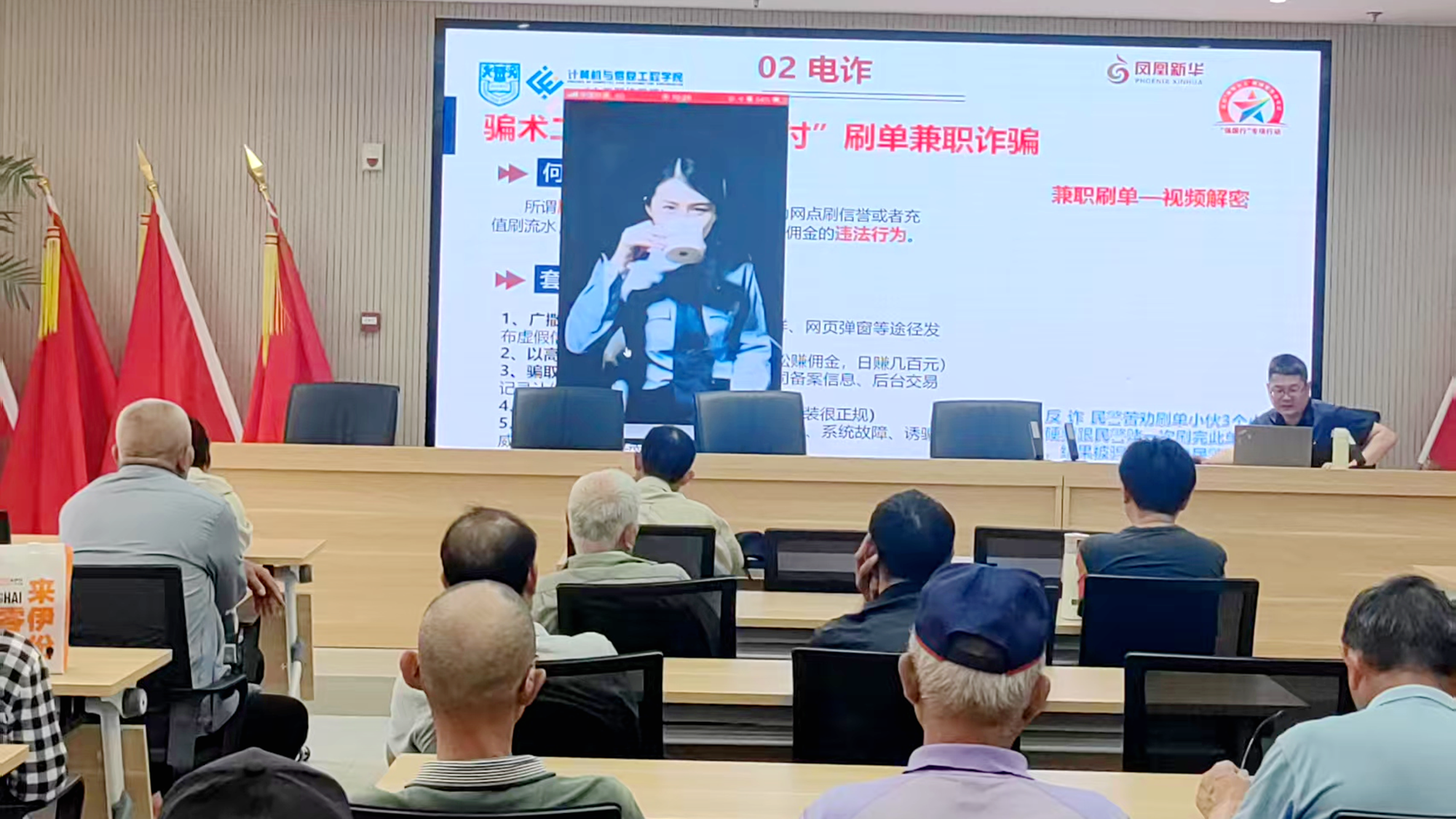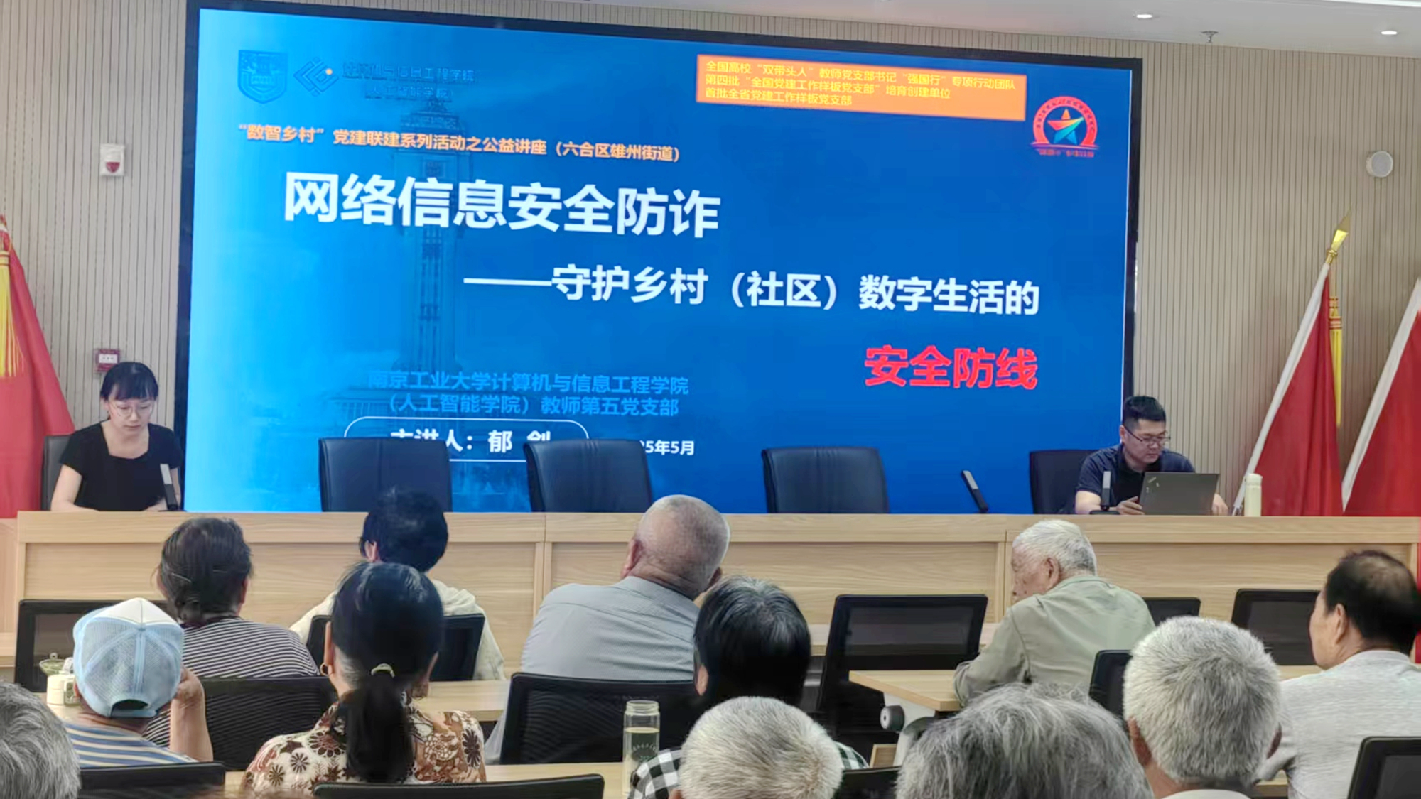 5月28日下午,beats365唯一官网入口官网教师第五党支部副书记郁剑受邀前往六合区雄州街道灵岩社区,开展了一场别开生面的“网络信息安全防诈”公益讲座。此次活动吸引了灵岩社区近50名居民积极参与,现场气氛热烈。