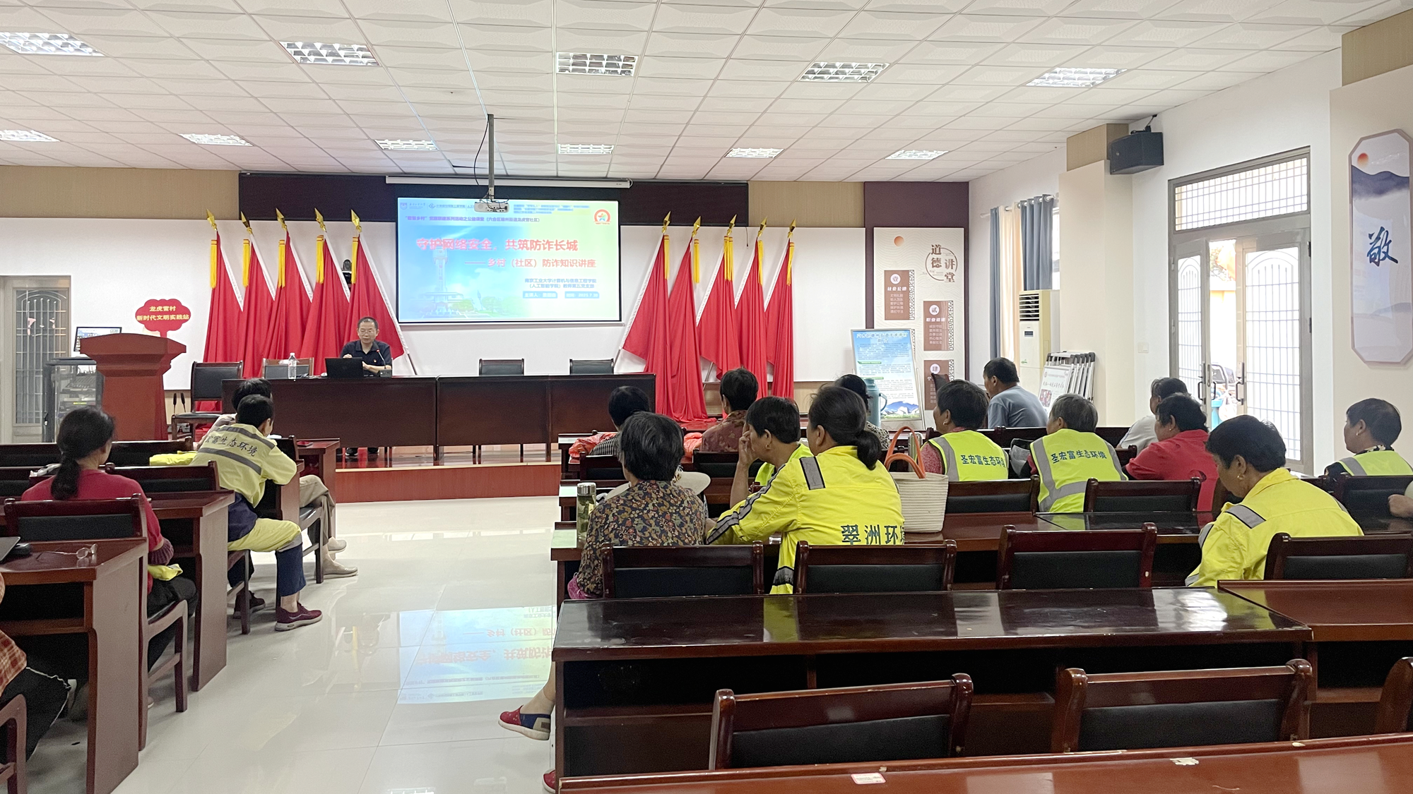 7月30日上午,beats365唯一官网入口官网教师第五党支部联合江苏凤凰新华书店集团有限公司六合分公司党支部,走进六合区雄州街道龙虎营村,成功举办了“数智乡村”党建联建系列活动之农家书屋公益课堂。支部书记景朋森为社区20余位中老年居民带来了一场别开生面的“守护网络安全,共筑防诈长城——乡村(社区)防诈知识讲座”。